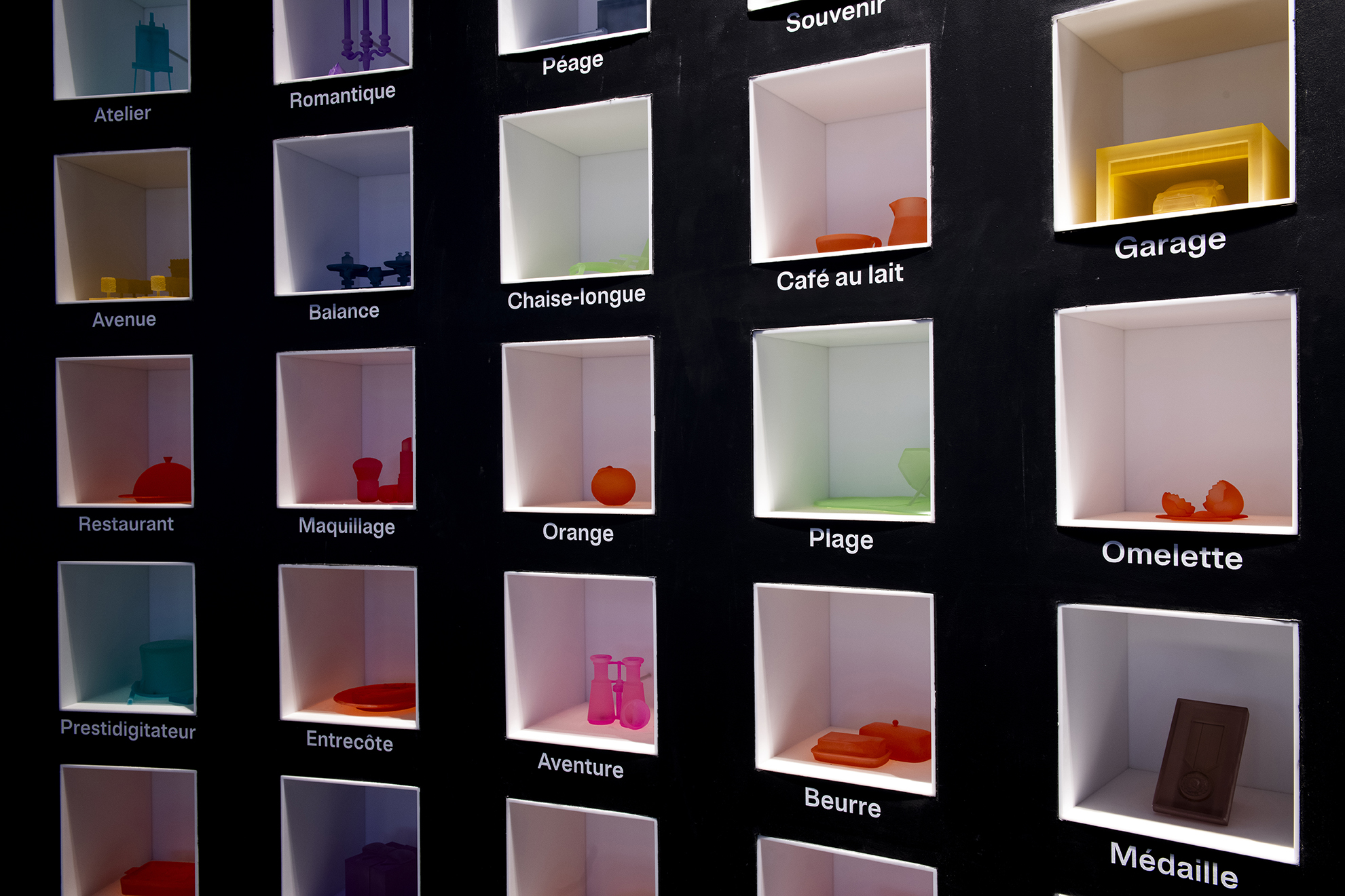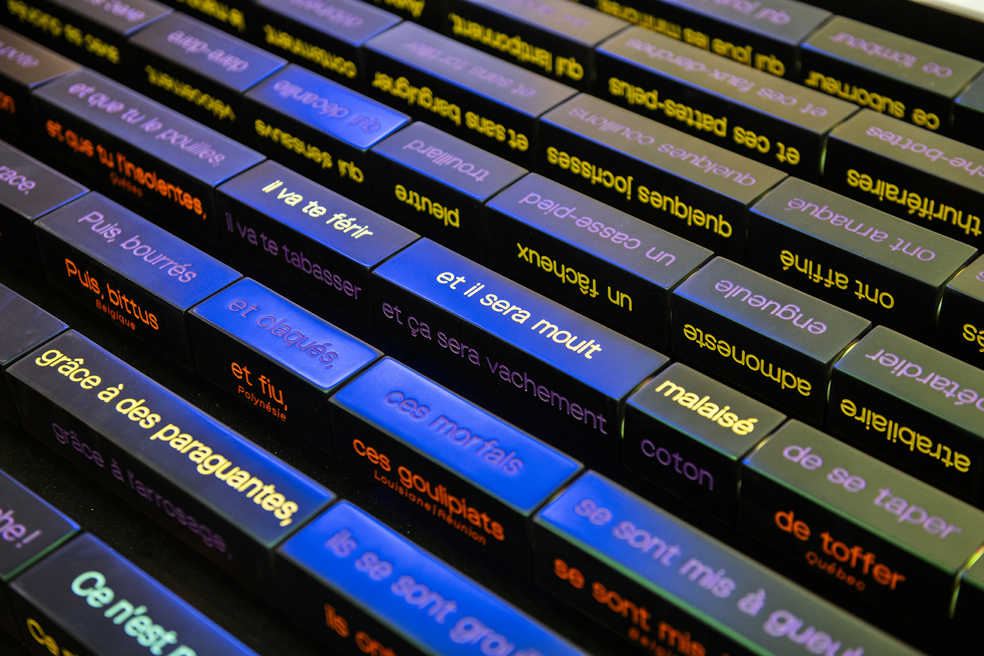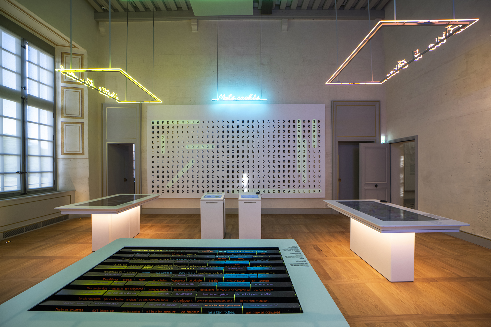 Les jeux autour de la langue se poursuivent dans une salle dédiée: les visiteurs peuvent s’affronter sur une grille de mots-mêlés géante, ou encore – au-delà du bien connu « pain au chocolat / chocolatine » – s’initier à la variété des mots régionaux pour désigner un même objet.