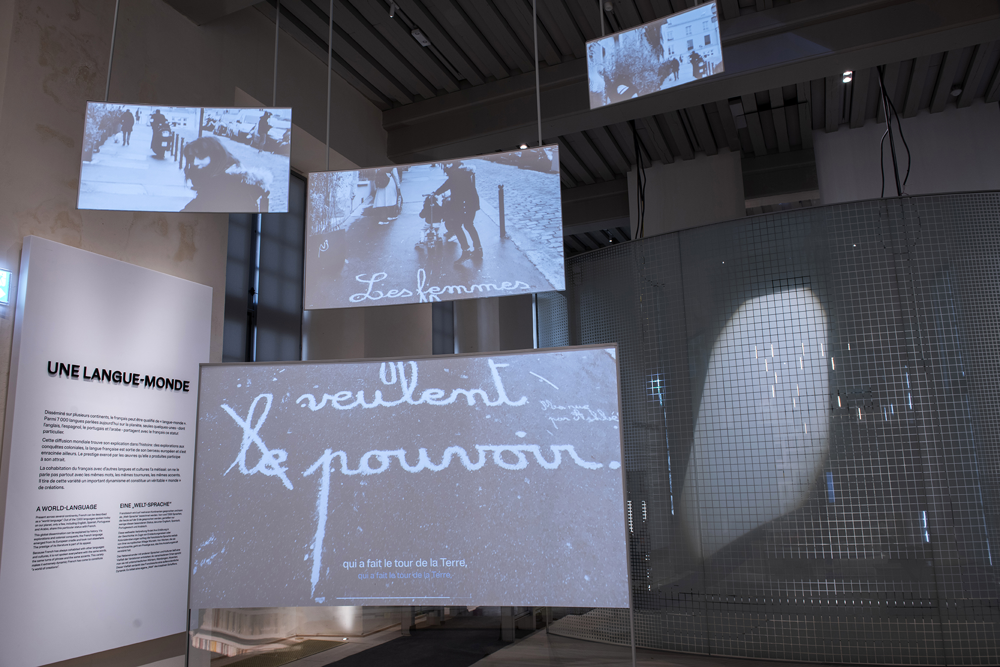 Comme dans un hall d’aéroport, un grand tableau des départs, projection monumentale présentant des destinations francophones, invite les visiteurs à embarquer pour un voyage dans la « langue-monde » qu’est le français.