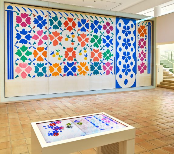 Mise en valeur par un verre Saint-Gobain ultra transparent, la nouvelle vitrine bénéficie d’un éclairage spécifique haut de gamme, pensé par la société ERCO (Lüdenscheid, Allemagne), qui permet de ne faire de compromis ni avec l’expérience visuelle ni avec la protection des œuvres. Les ingénieurs de l’entreprise ont en effet conçu un scénario lumineux permettant de retrouver la « vibration » des éléments de gouaches, mobiles, épinglés à même les murs de l’atelier de Matisse. Fleurs et fruits retrouve ainsi une relation privilégiée avec son public.