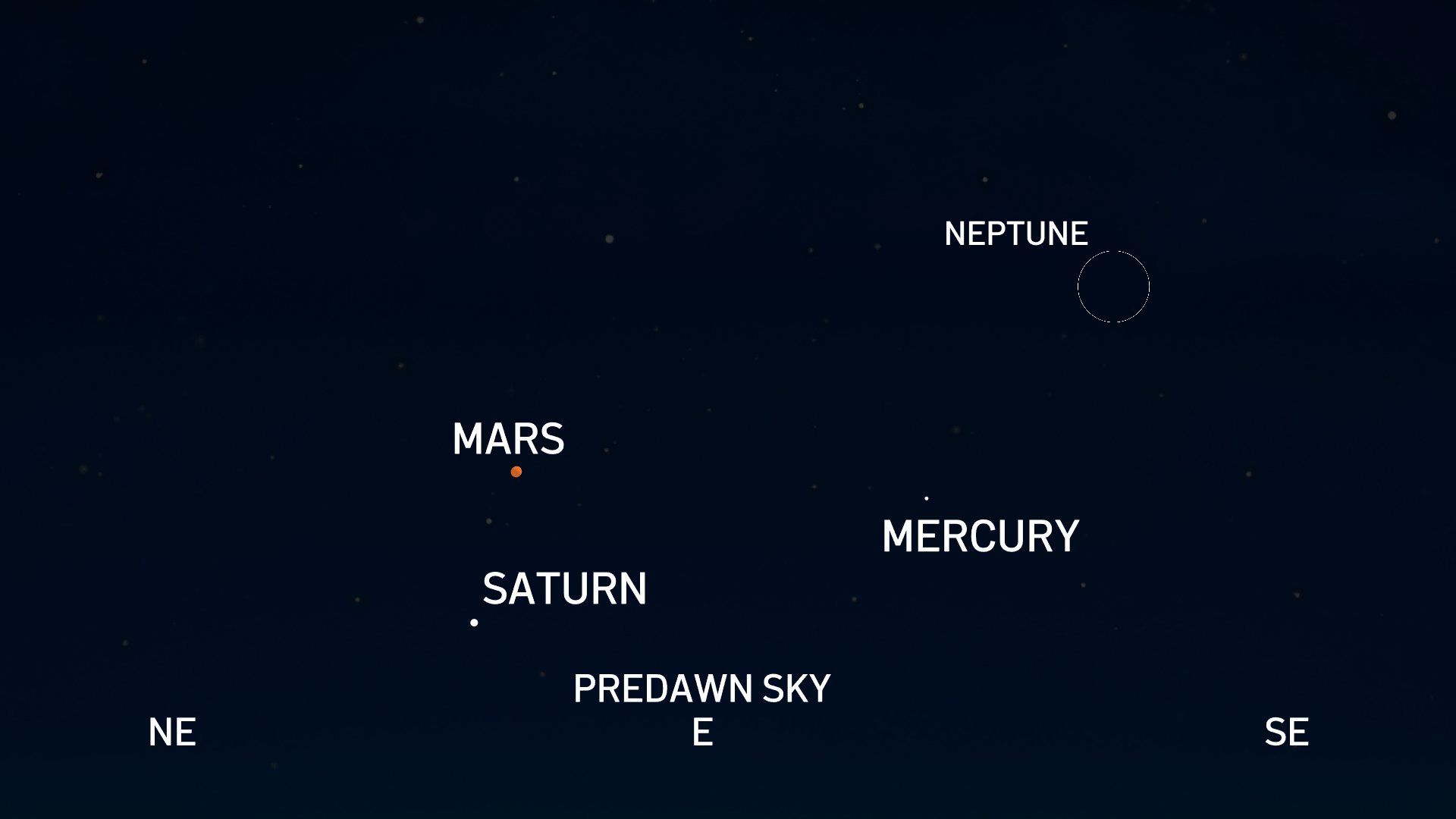 On April 18th, a rare “planet parade” will unfold as Mercury, Mars, Saturn and Neptune gather just before sunrise in a tight, diagonal grouping. Finding Neptune will require binoculars and an unobstructed view of the horizon.