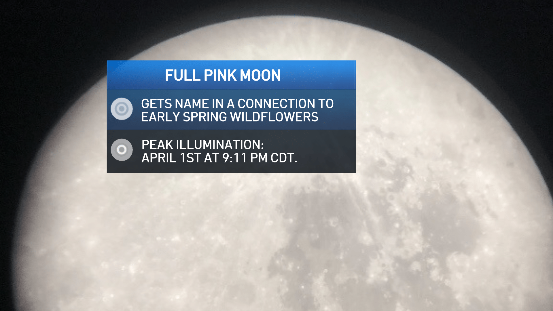The month will start with a full moon taking place on April 1st. The April full moon, known as the Pink Moon, will reach full illumination at 9:11 p.m. CDT.
