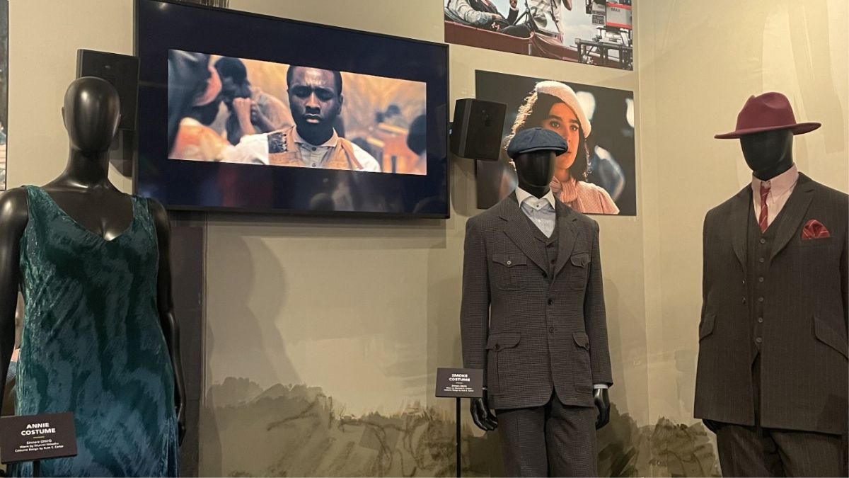 The display also includes costumes worn by characters like Annie played by Wunmi Mosaku, Delta Slim played by Delroy Lindo, Cornbread played by Omar Miller, and Mary played by Hailee Steinfeld.