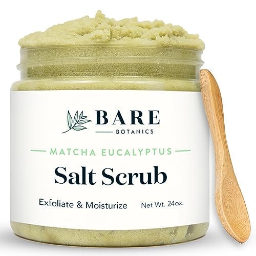 Bare Botanics Matcha Eucalyptus Body Scrub 24oz | Made in Madison, WI | All Natural Sea Salt Exfoliator w/Skin Loving Moisturizers | Vegan & Cruelty Free | Gift Ready Packaging w/a Cute Wooden Spoon
