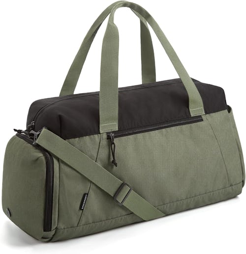 This lightweight, durable gym bag doubles as a duffel bag great for traveling. A large main zippered compartment holds all your basics, while a separate shoe compartment prevents street germs from getting on your clothes. Choose from black or army green in two sizes.