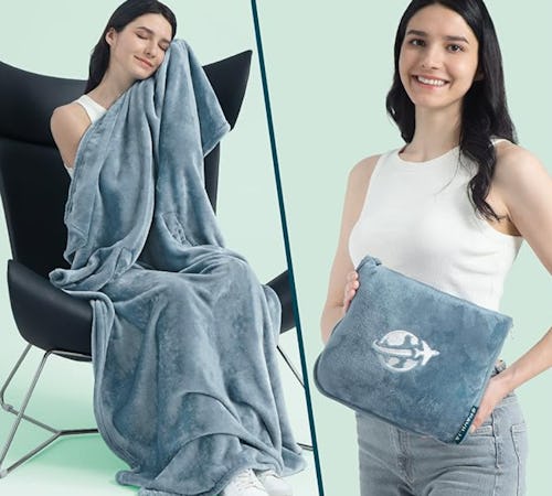 This compact travel blanket is a versatile must-have for any jetsetter. Made from soft fleece, the blanket unfolds to keep you cozy and has built-in arm holes so you can easily have snacks and watch in-flight entertainment. It also folds up and works as a pillow and hand warmer, and it has a luggage sleeve and backpack clip for easy carrying.