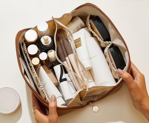 Keep your toiletries in perfect order with this cleverly designed makeup bag that opens up flat. It also has a sleek, expensive look, being made of faux leather, and has plenty of pockets inside to keep things nicely organized.