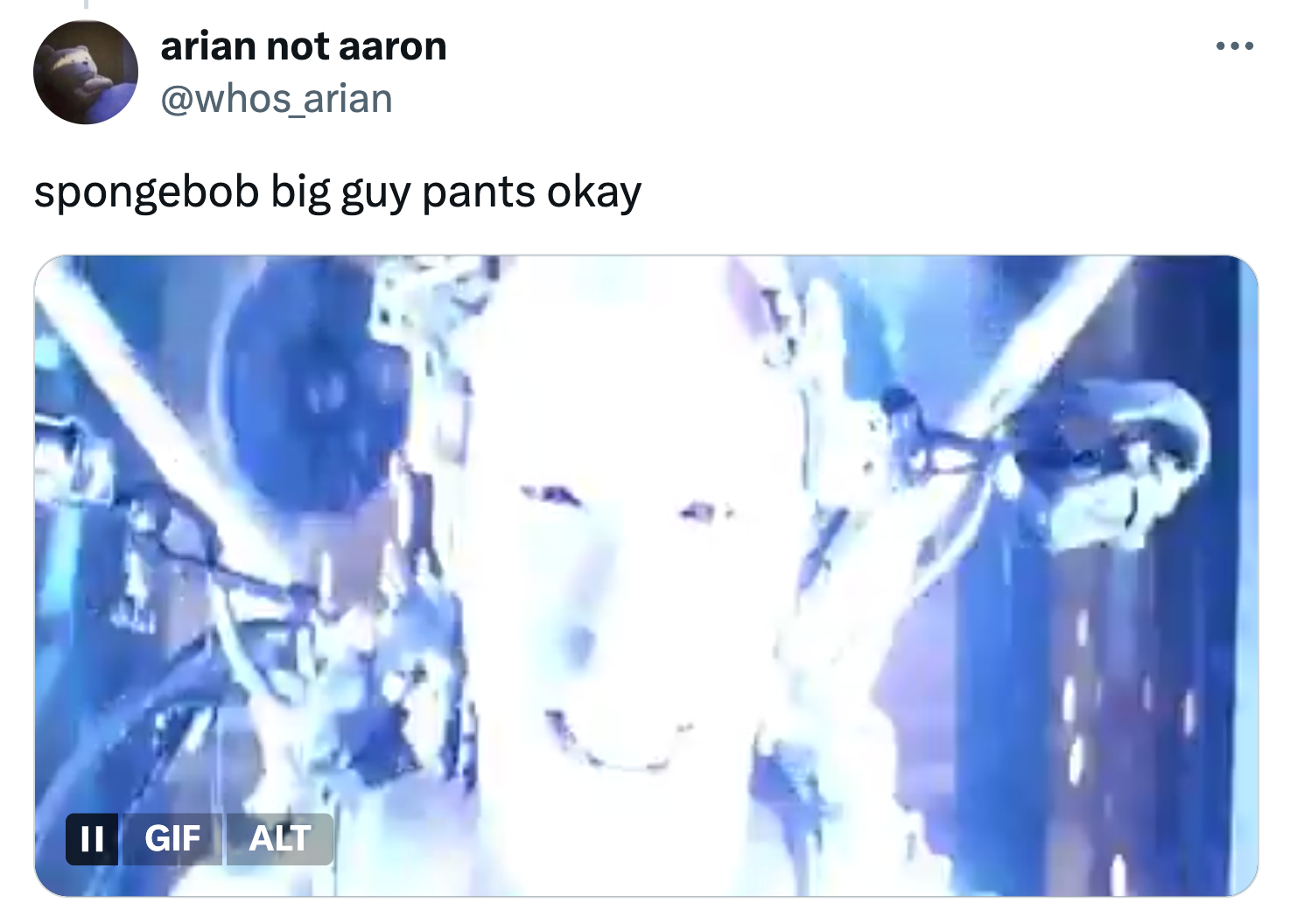 Others posted the line as a catchphrase meme with GIFs and images attached to it from across fandoms. People paired "SpongeBob, big guy pants, okay" with clips of characters doing confident walks, exaggerated animations, and dance videos. Sometimes, folks posted only the phrase itself as a standalone caption or reaction to another post.