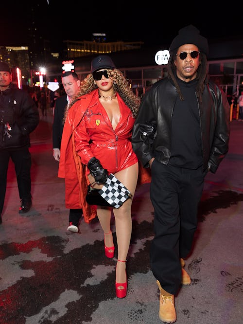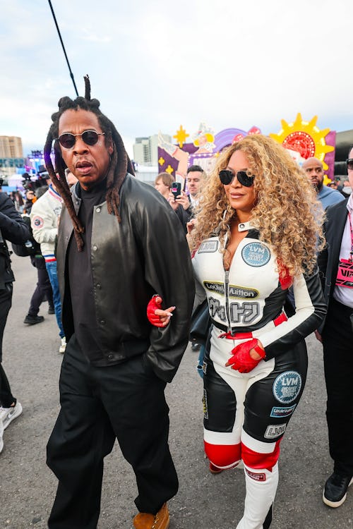 Escorted by her husband, Jay-Z, Bey stole the show on Saturday, Nov. 22, when she strolled in wearing a matching set made to look mimic a racer’s catsuit uniform. The top was a zip-up moto jacket that she unfastened real low to show off her décolletage. The “ALIEN SUPERSTAR” songstress paired it with matching high-waist pants.