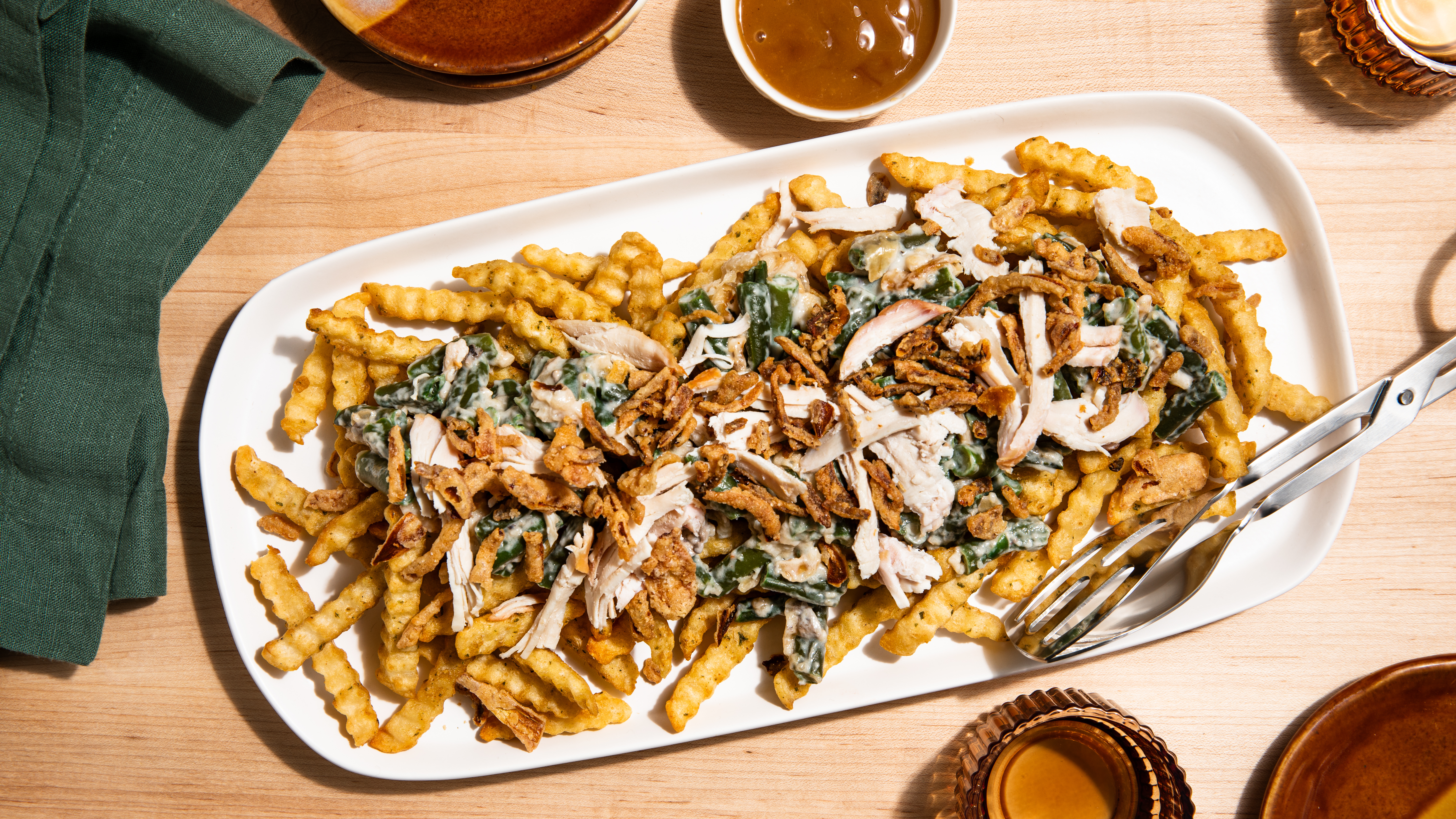 - Pile the fries in the center of a large platter or plate. Cover with turkey, then green bean casserole. Garnish with fried onions and serve immediately.
