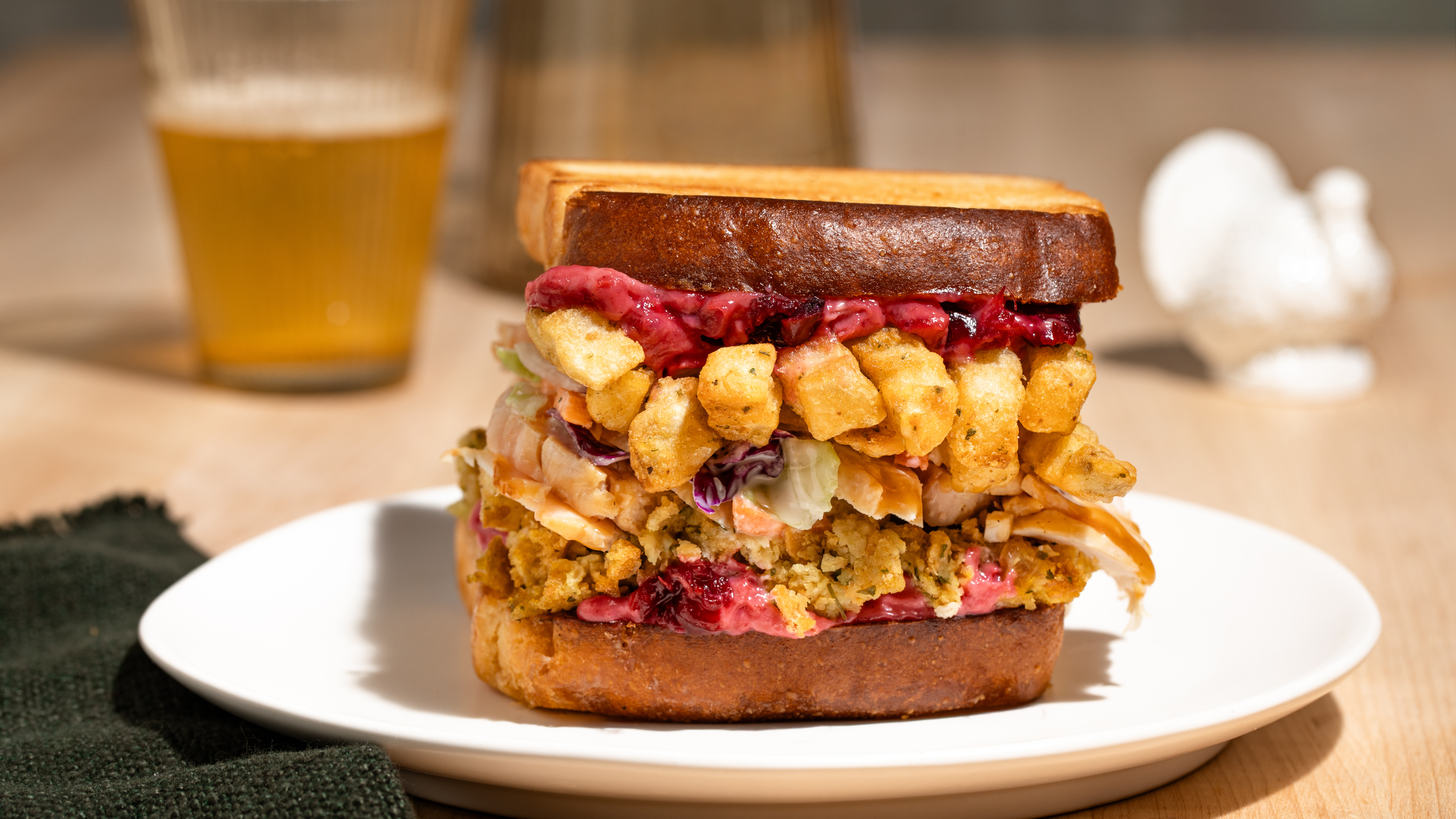 - Top one slice of bread with stuffing followed by cole slaw, turkey and fries. Spread cranberry mayo on other slice of bread and place on top of fries. Cut in half and enjoy immediately.
