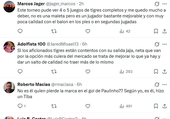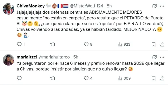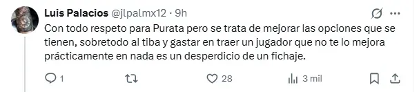 “Con todo respeto para Purata, pero se trata de mejorar las opciones que se tienen, sobre todo al Tiba y gastar en traer un jugador que no te lo mejora prácticamente en nada es un desperdicio de un fichaje”, expresó un aficionado. Y otro agregó: “Jajajajajajaja Dos defensas centrales ABISMALMENTE MEJORES casualmente ‘no están en carpeta’, pero resulta que el PETARDO de Purata SÍ, ¿nos queda claro que solo es ‘opción’ por B A R A T O, verdad? Chivas volvió a las andadas, ya se habían tardado. MEJOR NADOTA”.