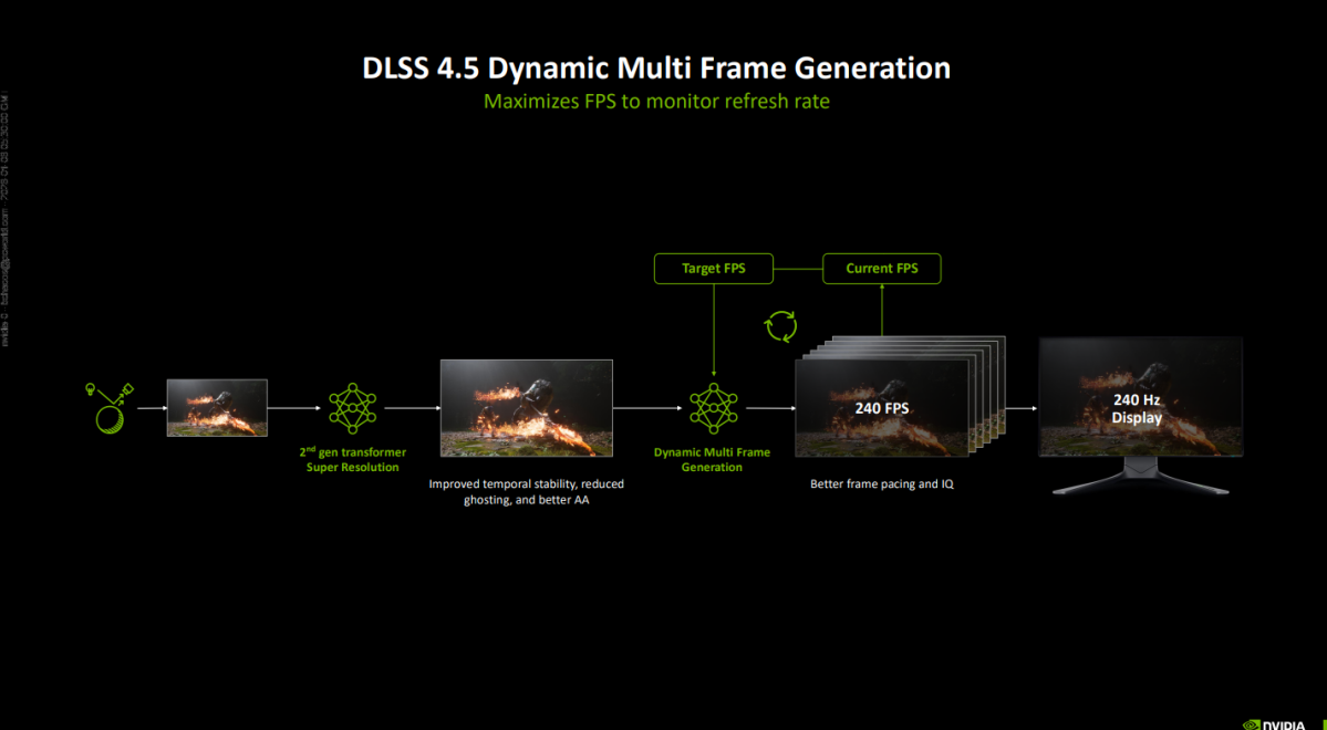 Whereas DLSS 4 can insert up to four AI-generated frames between every GPU-rendered frame to quadruple frame rates, DLSS 4.5 amps that up to 6x thanks to a new “Dynamic Multi-Frame Generation” feature. It shouldn’t add much additional latency over standard 1x frame gen thanks to the way the underlying technology works – and it could let more modest RTX 50-series cards like the RTX 5070 and 5070 Ti max out those spiffy 4K, 240Hz displays now available.