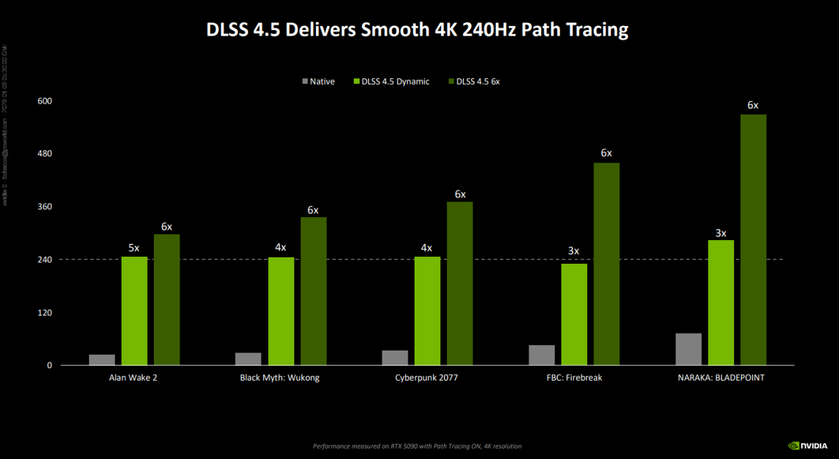 Hilariously, Nvidia used the ferocious RTX 5090 flagship to illustrate its claims. Why is it so funny? Because as the Nvidia-supplied graph below shows, the RTX 5090 can already hit 240Hz on 4K monitors even with vanilla 4x frame gen even in path traced games. Dynamic MFG’s 6x capabilities only help it blast past those levels – and past the refresh rate of even the most advanced 4K 240Hz monitors.