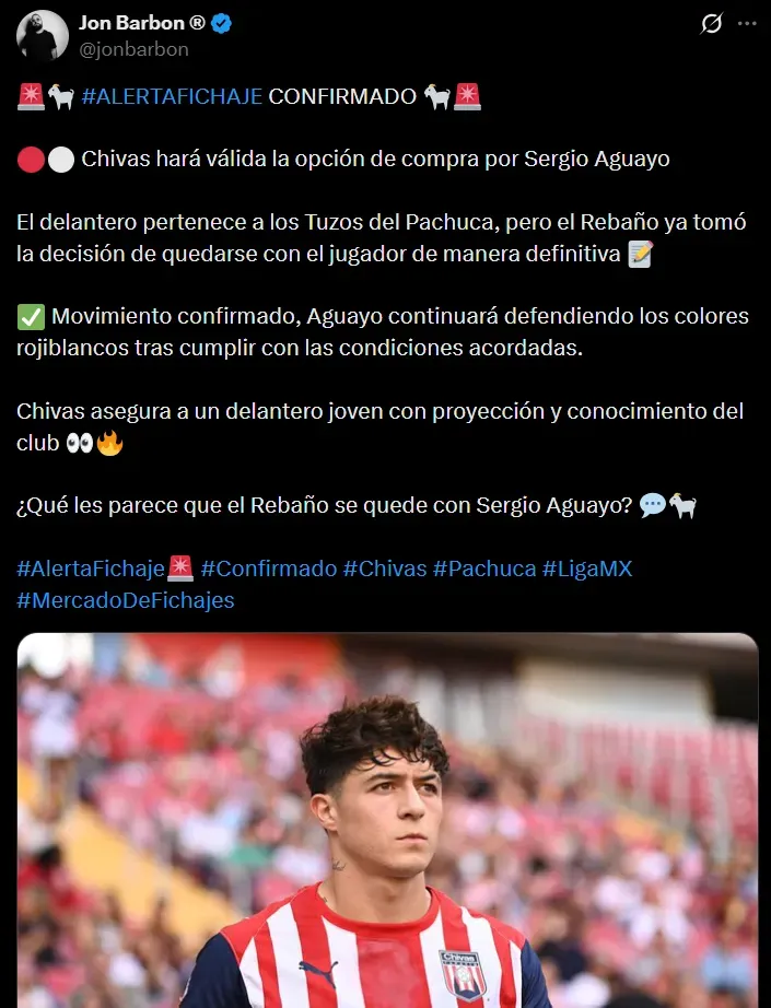 “Movimiento confirmado, Aguayo continuará defendiendo los colores rojiblancos tras cumplir con las condiciones acordadas. Chivas asegura a un delantero joven con proyección y conocimiento del club“, escribió el insider en su cuenta de X.