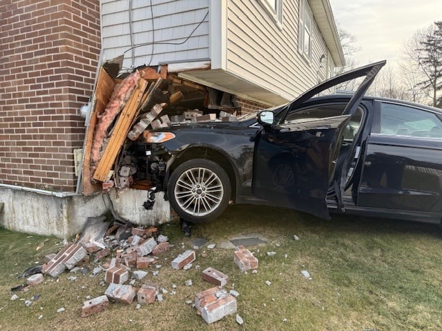 When first responders arrived, they found that a car had crashed into the lower brick portion of the home. Photos showed broken wood, smashed insulation and bricks on the ground next to the car. What looked like a window frame could also be seen on the lawn.