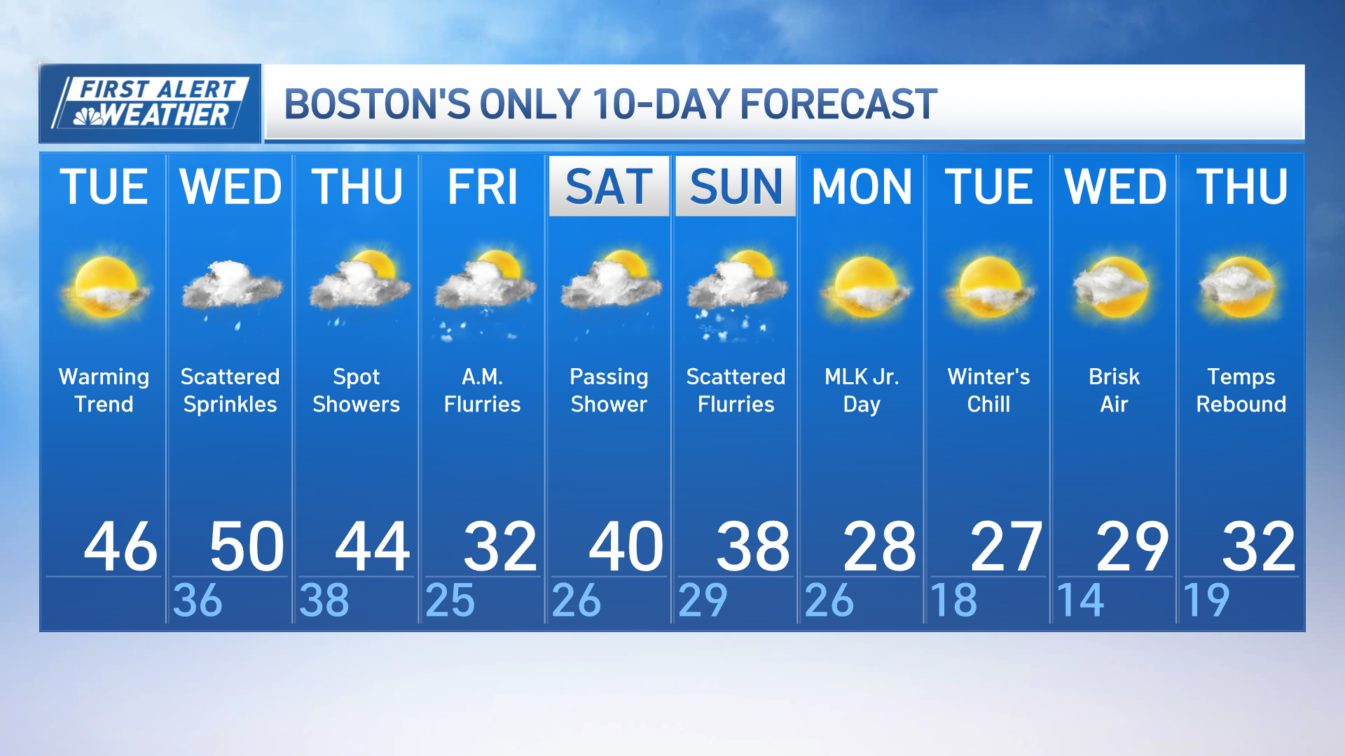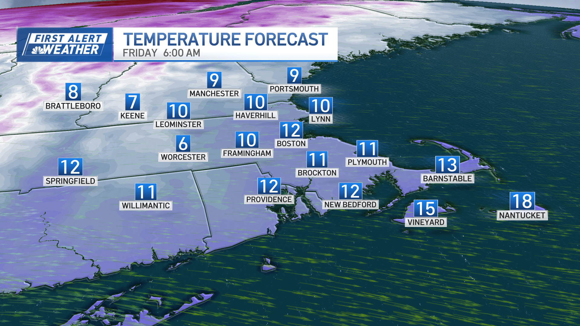 We’re not expecting widespread rain in Greater Boston. A few flakes are possible in the higher elevations toward Worcester Hills and the Berkshires. Low temperatures tonight will fall into the mid to upper 30s.