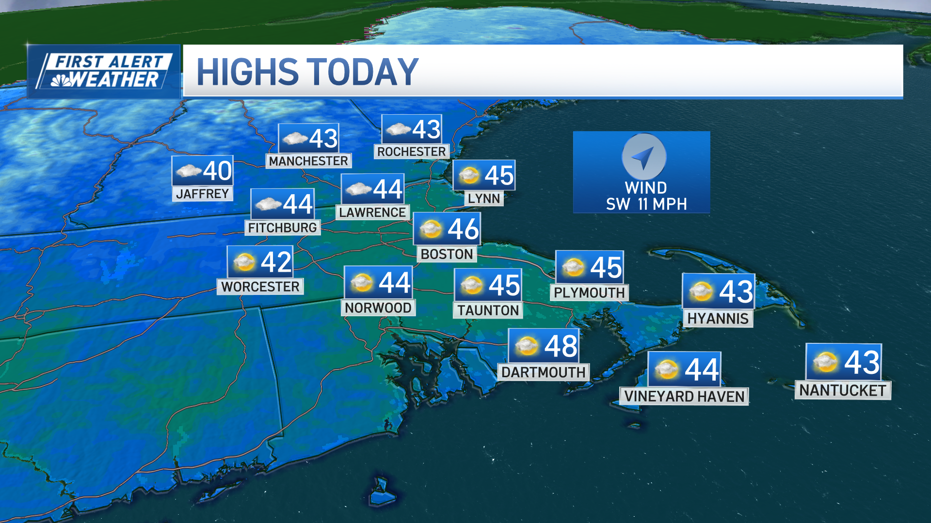 But first, for today, expect highs in the mid 40s under a mix of sun and clouds. The clouds will increase later today in advance of a weather system that could produce an isolated shower or two here and there tonight into Wednesday morning.