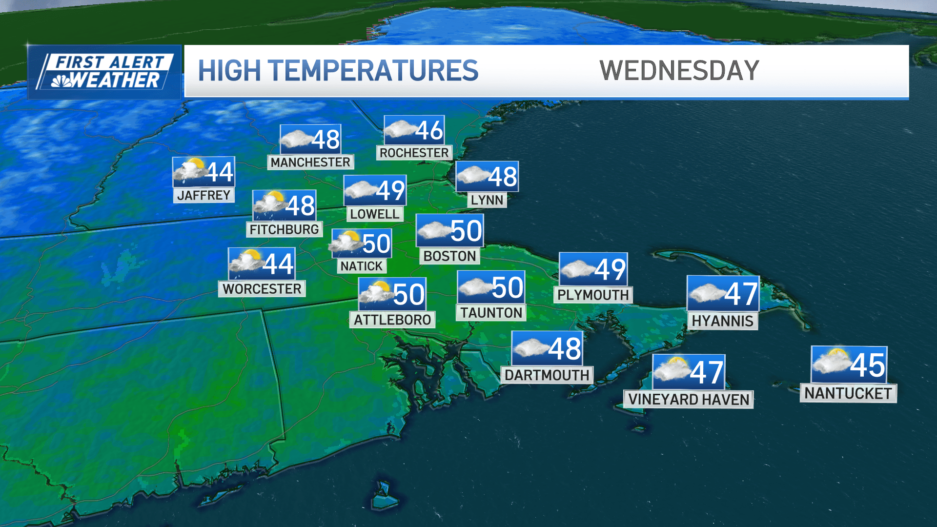 Wednesday will feature a lot of clouds. Again, a few spotty showers are possible. But our temperatures will be the main event. In fact, highs will climb to near 50 degrees!
