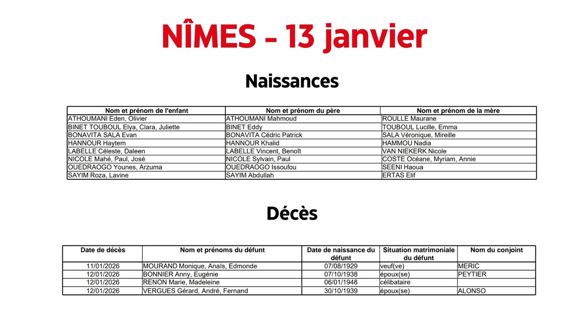 <h2>Nîmes : Naissances et décès du 13 janvier</h2>