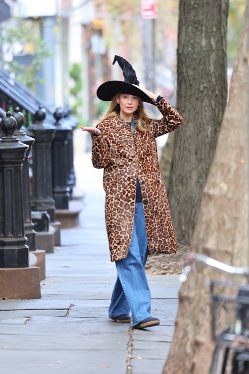 For her first outing, she paired the coat with flowy black trousers, clogs from Blundstone, and a navy blue dad cap, adding a pop of color with a bold red scarf. The next time, she wore her trusty wide-leg jeans and a black crewneck, plus a pointy witch’s hat to match spooky season.