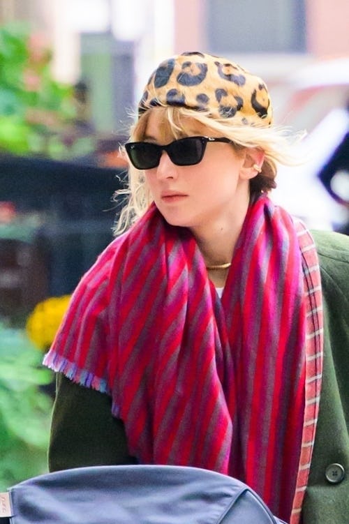 In November, J.Law sported a circular leopard-print cap along with a pine green double-breasted trench coat and a pastel-striped scarf, proving that she’s not afraid to color-block or pattern-clash. In some cases, leopard may even be the neutral part of her ensemble.
