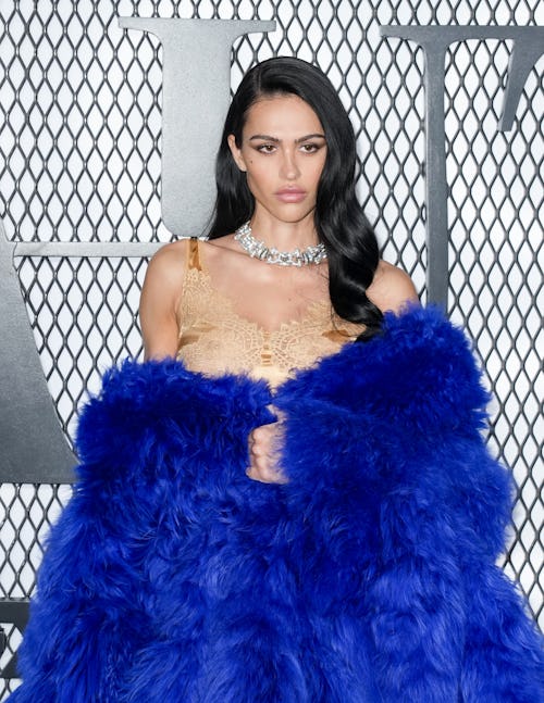 Styled by Danyul Brown, Hamlin wore a full look from Demna’s recent “La Famiglia” collection for Gucci. The model started her outfit with a silk lingerie-esque slip with lace edges. While it would have been in keeping with Hamlin’s model style to wear the piece solo, she had other ideas instead. Over the top of her dress, Hamlin slipped on a giant shearling coat done in a strikingly vivid blue color. The model draped the oversized piece over her figure, allowing for parts of her lingerie underpinning to poke through. To promote a show about the dangerous allure of beauty, what better to wear than an over-the-top coat with nothing but a little negligee underneath?