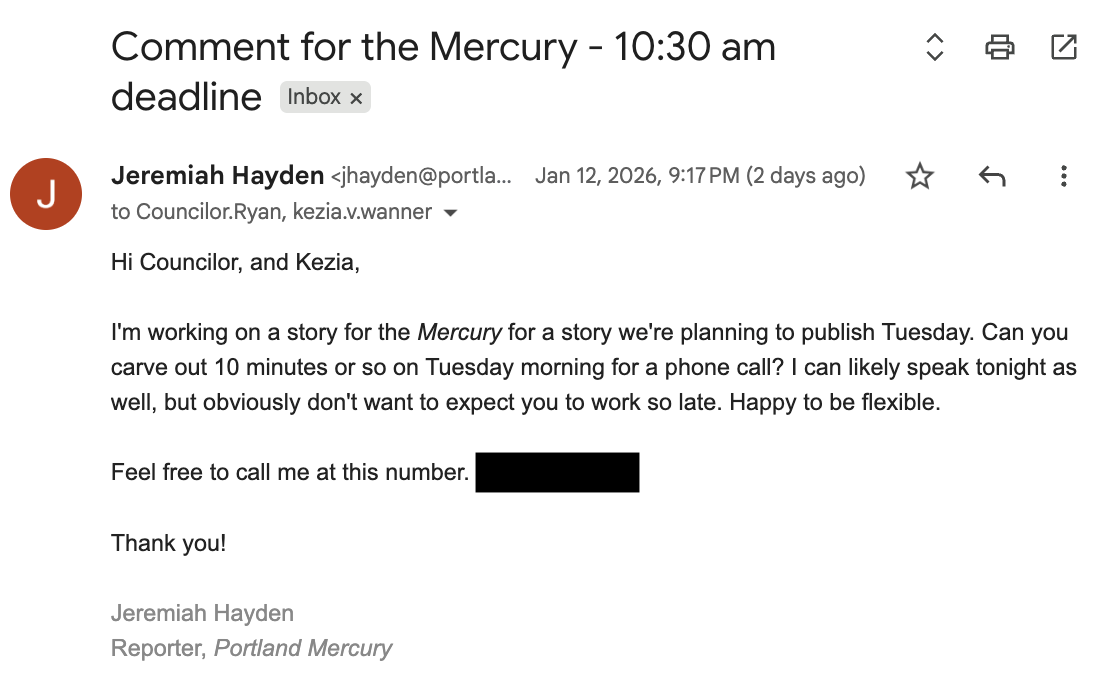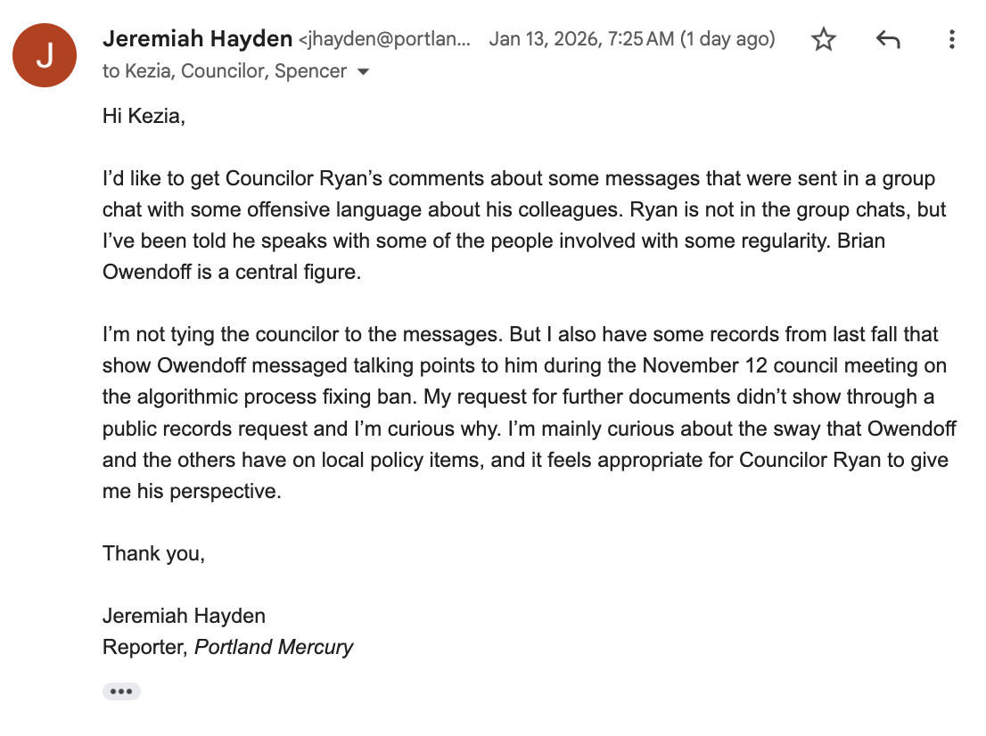 Toward the end of Wednesday’s afternoon meeting, Councilor Ryan falsely claimed he wasn’t provided context for the subject of the story, or given enough time to make an informed statement, despite email exchanges (below) that show otherwise. The story concerned a series of group chats that contained racist and offensive language about progressive city councilors of color. Ryan was asked for comment on the story because Owendoff, the person who sent and received the offensive messages, appears to have sway over Ryan’s policy decisions. Last November, Ryan had parroted messages sent to him from Owendoff when speaking during a Council meeting before a vote on a rental price-fixing software ban—a facet of the story published by the Mercury.