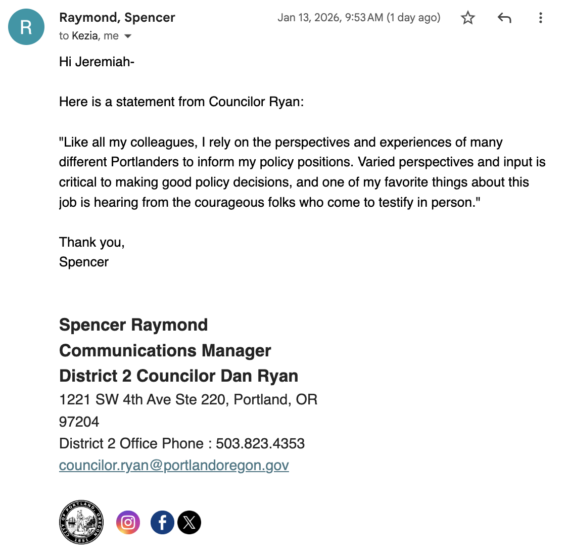 The Mercury reached out to Councilor Ryan and his Chief of Staff, Kezia Wanner, the evening before publishing the story about Owendoff and his associates.
